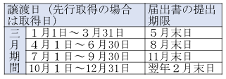 なお、令和6年4月1日以後、同一年中に譲渡資産の譲渡と買換資産の取得の両方を行う場合は、事前に届出が必要になりました。届出書は譲渡の日(買換資産の先行取得の場合はその取得日)を含む三月期間の末日の翌月から2月以内に提出します。