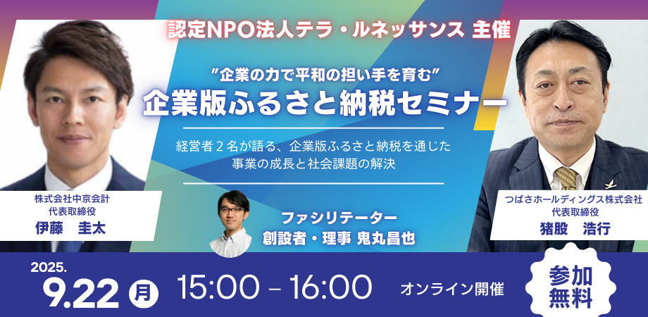 終了 【WEB開催_2025/9/22】企業版ふるさと納税を通じた事業の成長と世界平和への貢献!代表の伊藤が登壇します
